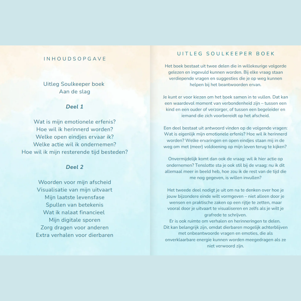 In het Soulkeeper invulboek neem je dierbaren mee door je leven – de hoogte- en dieptepunten, de momenten die ertoe deden, en de levensvragen die je bezig hebben gehouden. Ook werp je alvast een blik vooruit op wat jouw wensen zijn en wat je achterlaat als je er niet meer bent. De verhalen die raken, maar vaak onbesproken blijven.