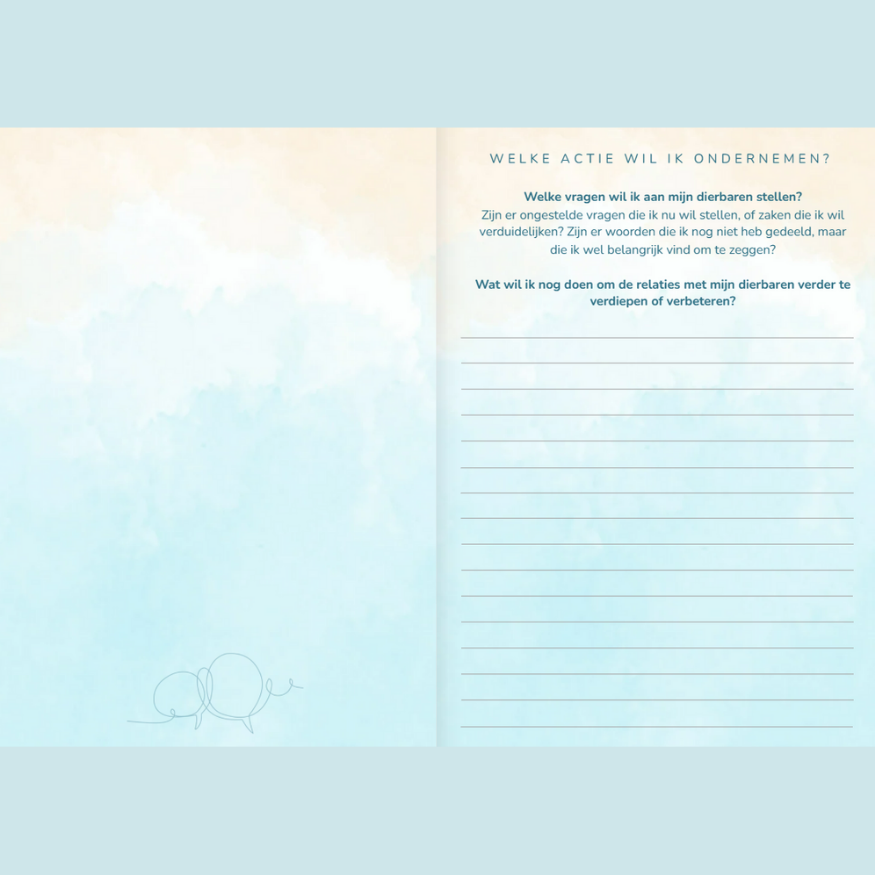 Je kunt er daarom voor kiezen om het boek samen in te vullen. Dat kan een waardevol moment van verbondenheid zijn: tussen een kind en een ouder of verzorger, of tussen een begeleider en iemand die zich voorbereidt op het afscheid. Samen stilstaan, samen herinneren, samen delen – juist daarin schuilt de kracht van dit boek. Op de website vind je bij elk onderdeel en vraag inspiratie om je op weg te helpen.
